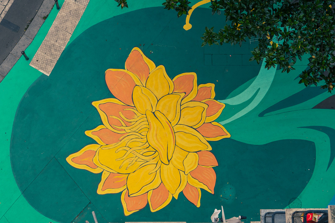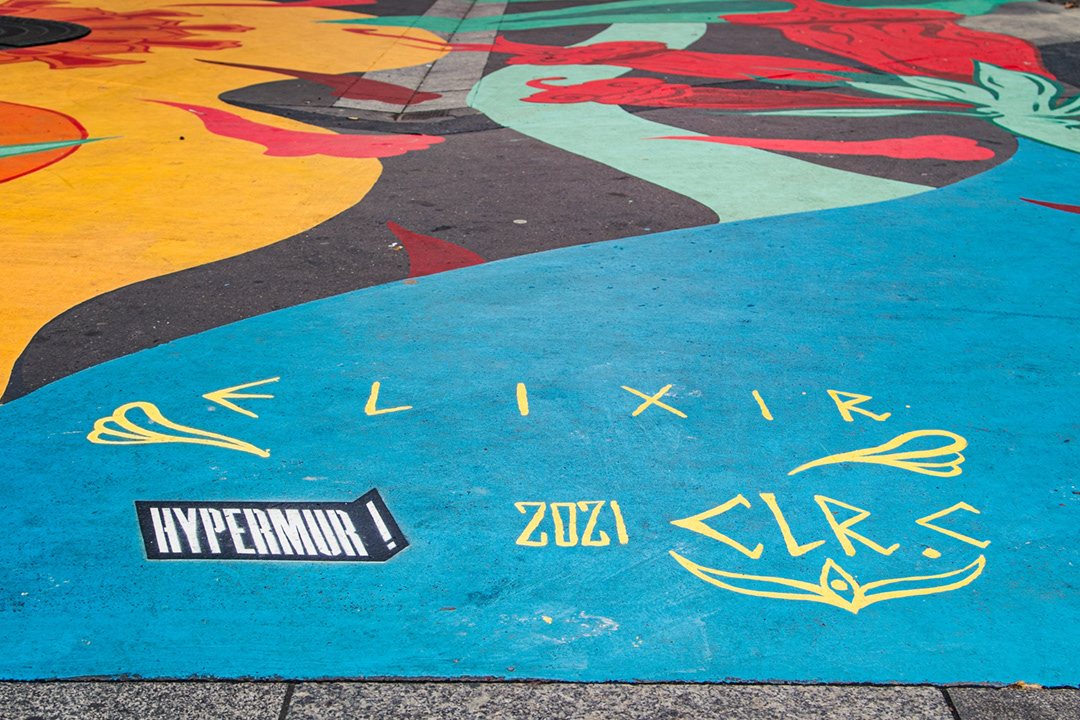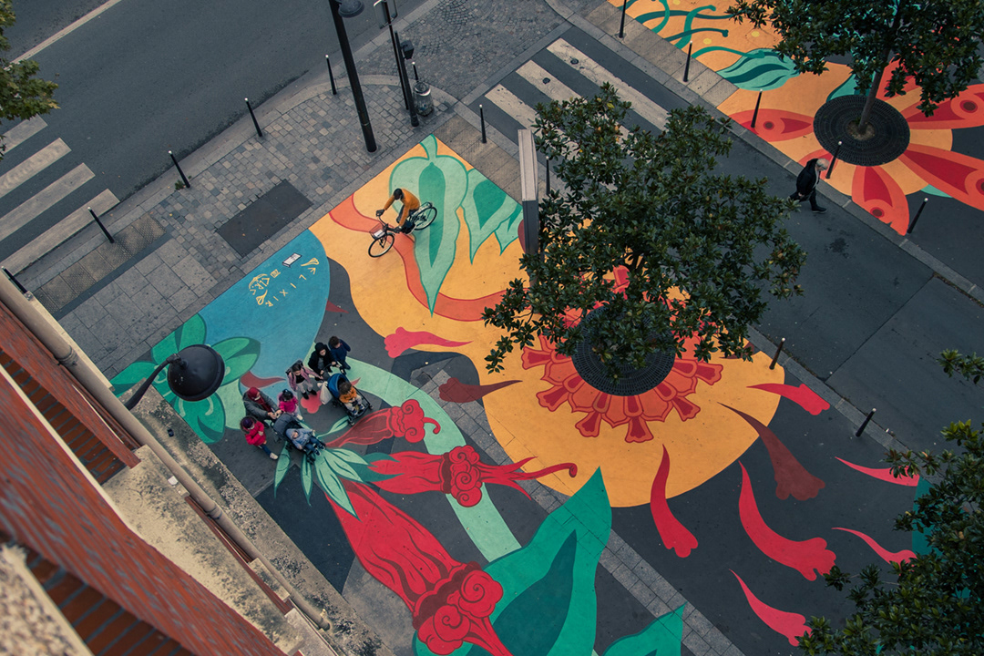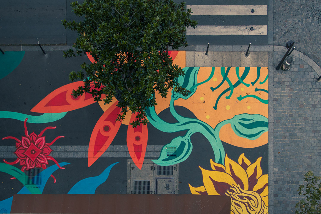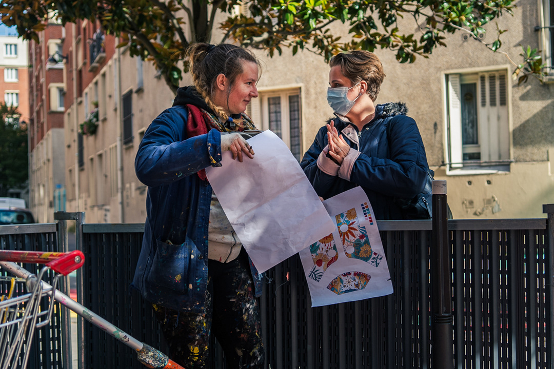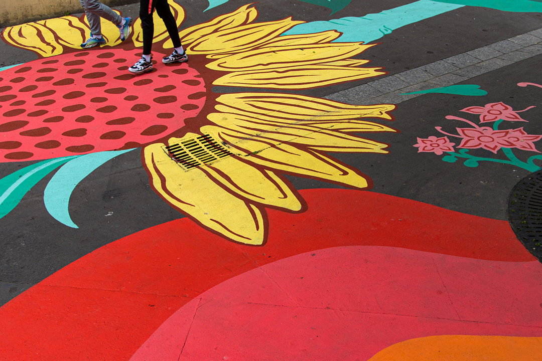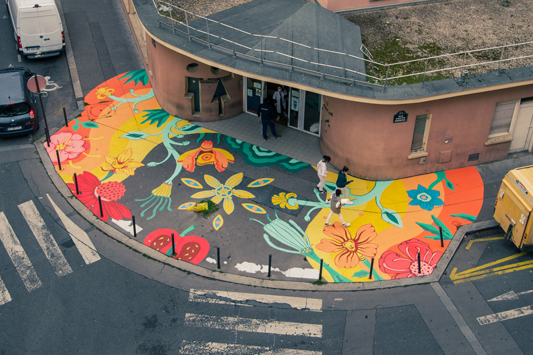 En 2020, entre deux confinements, nous sommes allées interroger les habitants du quartier Charles Hermite à la Porte d’Aubervilliers (Paris 18). Avec l’urbaniste Rachel Mullon, nous avons animé des groupes de parole au sujet du rapport des habitants à leur espace public en cette année si particulière de restrictions des déplacements et d’isolement. Et c’est ainsi qu’un an plus tard, pour répondre aux demandes des habitants, l’association a invité les artistes Cécilio, Claire Courdavault et Gilbert Petit, à répandre des fleurs peintes sur les trottoirs de certains lieux clefs du quartier. Chacun dans son langage pictural, les trois artistes explorent le végétal, sa place dans la ville, et sa place dans nos vies, de la nature cocon maternel de l’œuvre de Cécilio devant l’école maternelle, à la jungle vibrante et joyeuse de Gilbert Petit devant l’entrée du skatepark, en passant par la botanique médicinale et magique de Claire Courdavault devant l’hôpital de jour pour enfants.