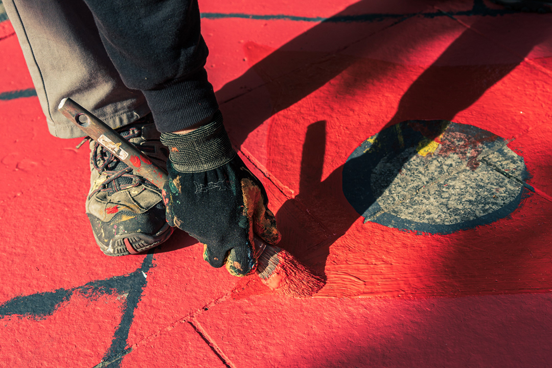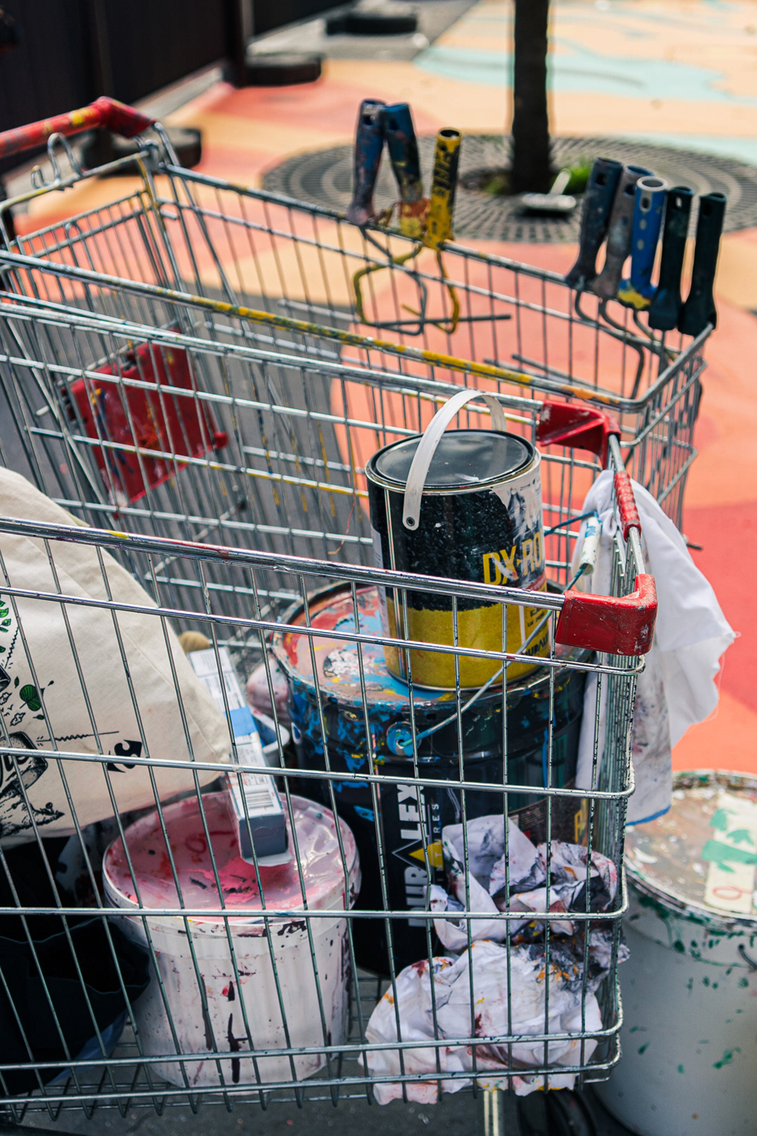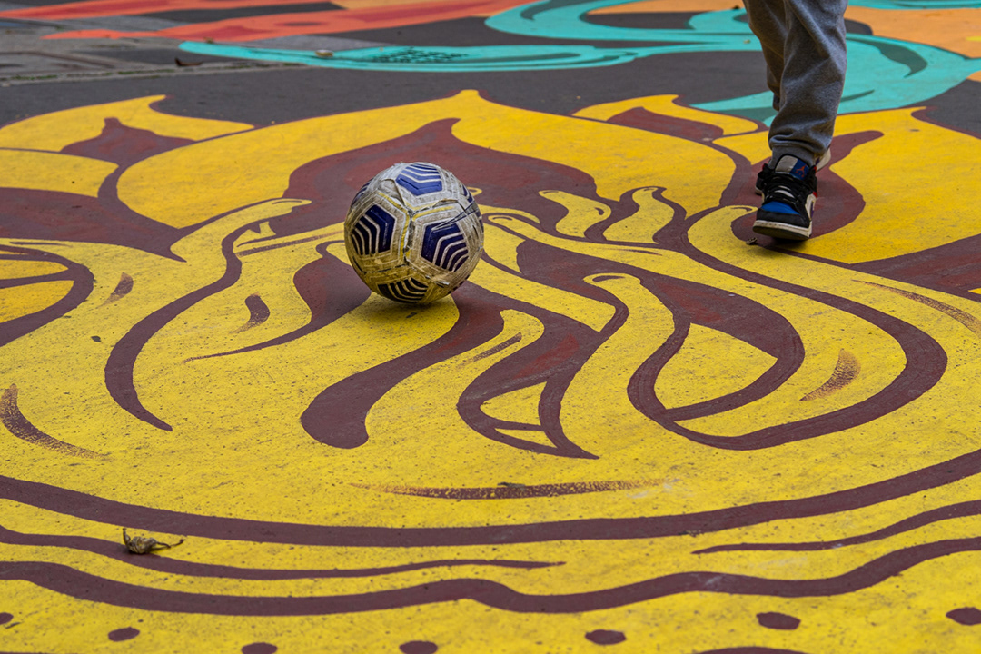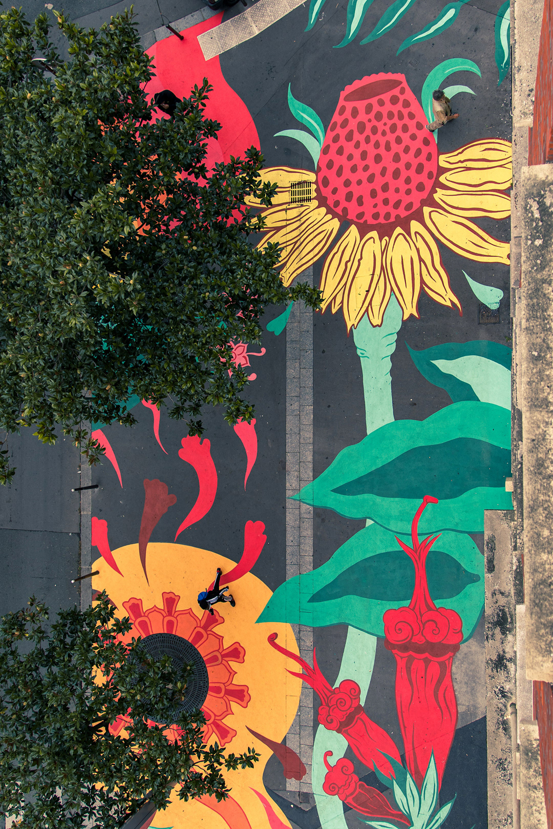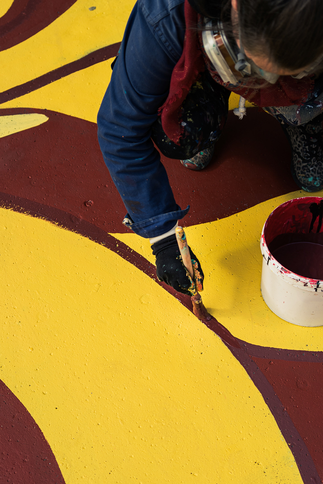 En 2020, entre deux confinements, nous sommes allées interroger les habitants du quartier Charles Hermite à la Porte d’Aubervilliers (Paris 18). Avec l’urbaniste Rachel Mullon, nous avons animé des groupes de parole au sujet du rapport des habitants à leur espace public en cette année si particulière de restrictions des déplacements et d’isolement. Et c’est ainsi qu’un an plus tard, pour répondre aux demandes des habitants, l’association a invité les artistes Cécilio, Claire Courdavault et Gilbert Petit, à répandre des fleurs peintes sur les trottoirs de certains lieux clefs du quartier. Chacun dans son langage pictural, les trois artistes explorent le végétal, sa place dans la ville, et sa place dans nos vies, de la nature cocon maternel de l’œuvre de Cécilio devant l’école maternelle, à la jungle vibrante et joyeuse de Gilbert Petit devant l’entrée du skatepark, en passant par la botanique médicinale et magique de Claire Courdavault devant l’hôpital de jour pour enfants.